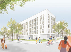 Der Entwurf gliedert das Grundstück in zwei ungefähr gleich große, jeweils an den Quartiersplatz angrenzende Bauabschnitte auf. Die vorgeschlagene Bebauung nimmt mit ihren insgesamt acht einzelnen Baukörpern die Merkmale der umgebenden Bebauung, wie Maßstäblichkeit, Gebäudestellung, Kubatur auf, und fügt sich selbstverständlich in die umgebende Bebauung ein.